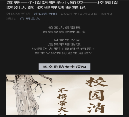 为拓宽消防知识的宣传渠道,公司充分利用官方网站和公众号等新媒体平台,定期发布消防安全知识、案例分析、应急处理技巧等内容。这些宣传内容既贴近员工生活实际,又具有较强的针对性和实用性,深受员工们的喜爱和关注。通过新媒体平台的广泛传播,进一步增强了全院师生的消防安全意识和应急处理能力。