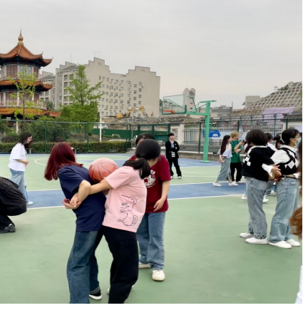 随着一声哨音,“全副武装”的同学们依次上场了,你瞧!同学们两两组队,背靠背夹着篮球,像一对张牙舞爪的螃蟹。“一二一、一二一”,这些可爱的大“螃蟹”步调一致,向着胜利前进!