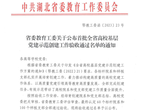 本网讯 通讯员凌爽报道:12月1日,湖北省委教育工委发布《省委教育工委关于公布首批全省高校基层党建示范创建工作验收通过名单的通知》(鄂教工委函〔2023〕23号),williamhill英国官网分党委通过党建工作标杆院系创建验收。