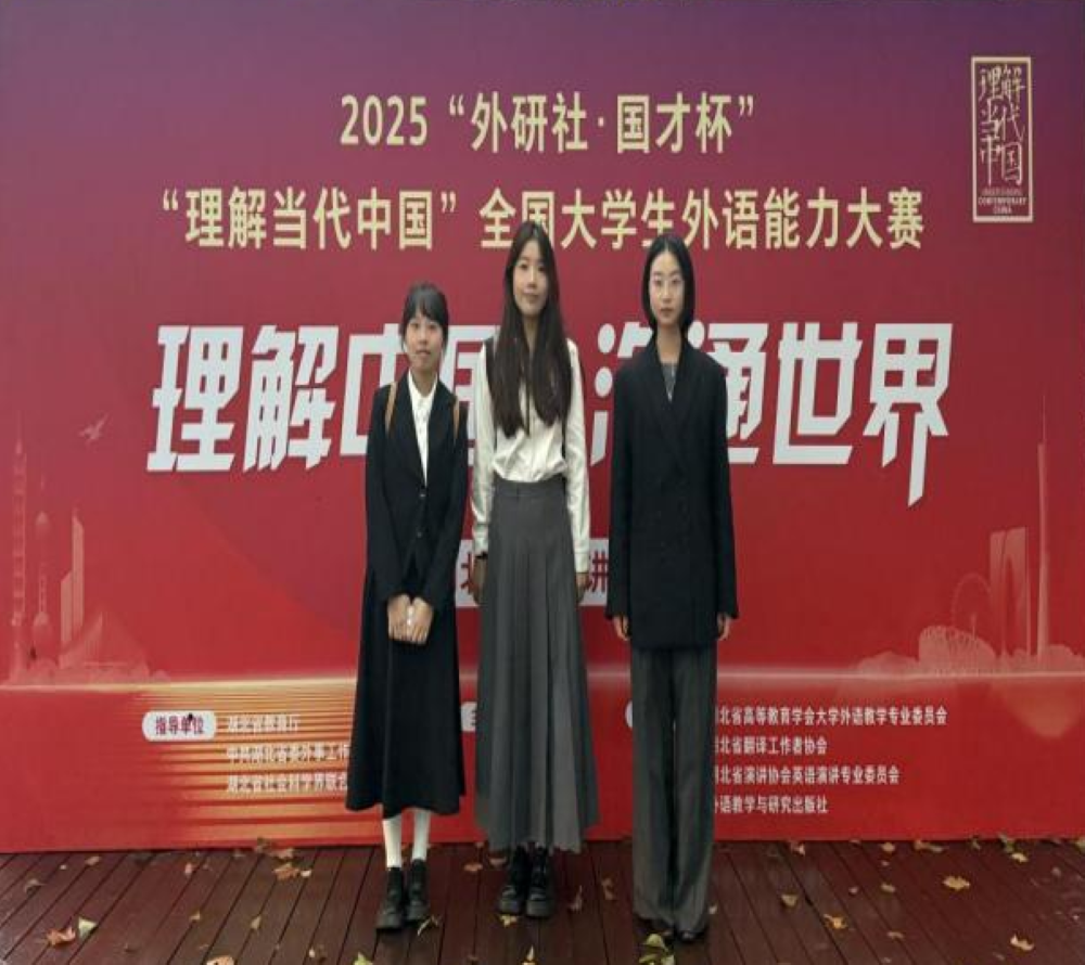 在第四届“外教社”杯湖北省高校员工跨文化能力大赛中,余新星、余婷、方照三位老师指导游智康、李浠蕊、洪子健三位同学完成作品《棋语相通》,以出色的语言应用能力、敏锐的跨文化意识和高效的团队协作,在激烈角逐中沉着应战、稳定发挥,勇夺大赛一等奖。
