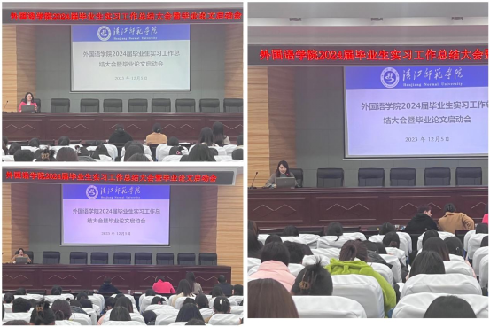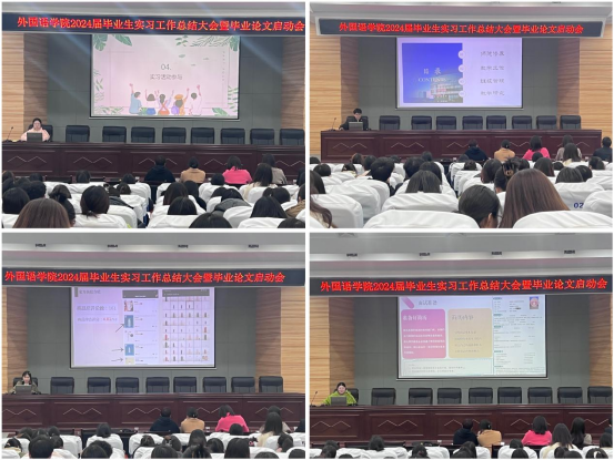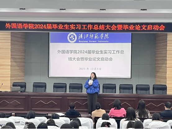 会上,五位实习生代表依次对自己的实习工作进行了分享和总结。英语专业实习生代表叶昭兰、代雅晴、张良源分别从师德师风、教学工作、班级管理和教学研究四大板块分享了自己的实习经历,并表示这些生动鲜活的实践、指导老师的建议是在书本上无法获取的,今后一定继续发扬严谨治学的精神,向成为一名优秀的教师不懈努力。商务英语专业实习生代表涂思兰、李政义两位同学对实习企业、工作内容做了介绍,从面试准备到进入工作角色再到最后能够独立完成订单,她们更加了解了外贸,也坚定了未来的职业选择。