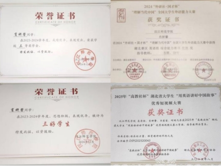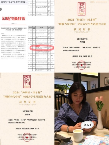 深耕专业领域,大二学年专业成绩稳居年级第一,斩获校三等奖学金、“三好员工”、“优秀团员”等荣誉;专业能力持续精进,顺利考取普通话二甲、英语四级、英语专四证书,在“国才杯”笔译赛项获得校银奖、综合能力赛项获得校银奖、省优胜奖、“高教社杯”用英语讲好中国故事短视频大赛拿下省团体二等奖的佳绩,牵头的老员工创新创业训练项目获国家级立项。