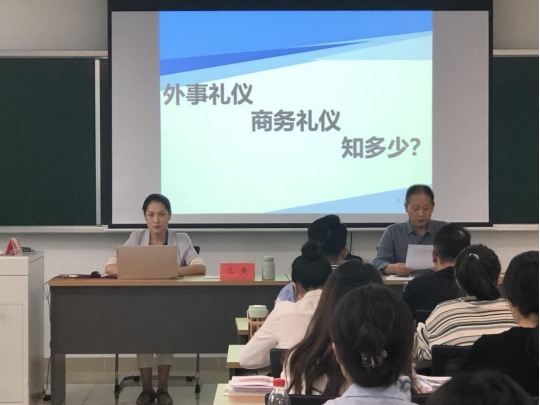 王爽副教授讲座题目是《外事礼仪、商务礼仪多少?》,她从外事礼仪的重要性导入,围绕规范仪容、规范表情、规范举止、规范服饰娓娓道来,引出维护形象的重点原则:承认差异、入乡随俗、遵守惯例、尊重隐私。随后,举例说明、生动讲解了会议礼仪、会面礼仪、介绍礼仪、名片礼仪,并恰到好处地与学员互动交流,气氛热烈。
