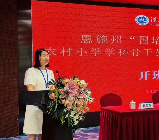 学员代表、利川市教学研究和教师培训中心小学英语教研员彭铃上台发言。她从自己四年前参加省培后的成长谈起,表示会抓住这次难得的学习机会,热情投入,不折不扣地完成培训任务,并且把所学知识尽快地应用到工作实践中去。