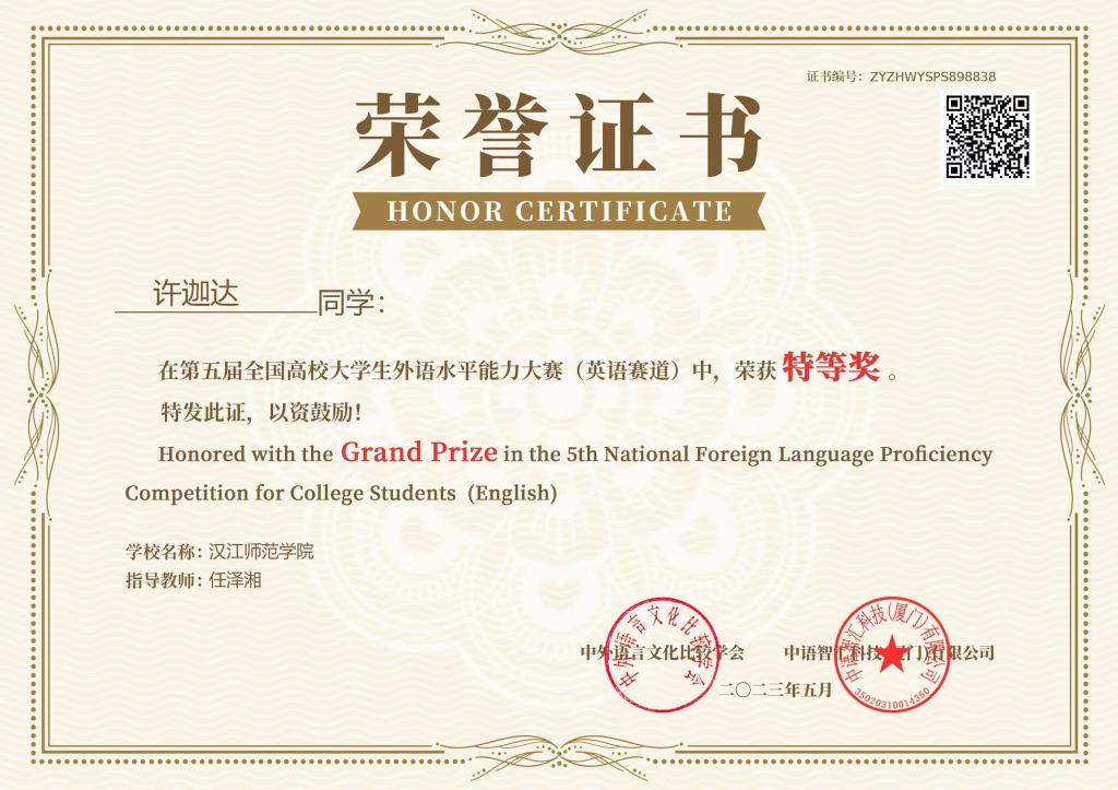本网讯 通讯员任泽湘报道:近日,全国高校老员工外语水平能力大赛组委会传来好消息,williamhill英国官网小学英语教育2102班的许迦达同学在第五届全国老员工外语水平能力大赛(英语赛道)决赛中,以87.2分获得特等奖。 许迦达同学自入学以来积极参与各类赛事,目前已获多项奖项,如:2022年5月,在第二届“外教社·词达人杯”全国...